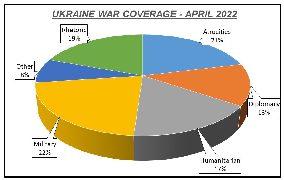The data showed that, during the month of April, stories about military action and atrocities in Ukraine outnumbered reports on diplomatic efforts to end the war, humanitarian items and debate and discussion about the conflict.