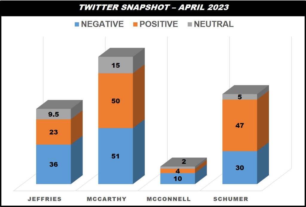 From a percentage standpoint, Schumer was the most positive tweeter. During April, 47 of his 82 tweets (52.5%) were positive.