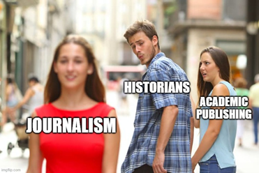 The relationship between history and journalism is a little like that meme of the boyfriend looking at another woman. Academic historians are often criticized for not speaking to larger audiences, and trends within education reinforce the need to make history relevant. A typical scholarly book or journal article can take years to research and write with an intended audience of fellow scholars in the field. This means that a scholarly monograph (a fancy word for a scholarly work) will sell hundreds, maybe thousands, of copies or less. Many of the books and journals will go into academic libraries, either digitally or physically, waiting to be checked out by scholars and students.