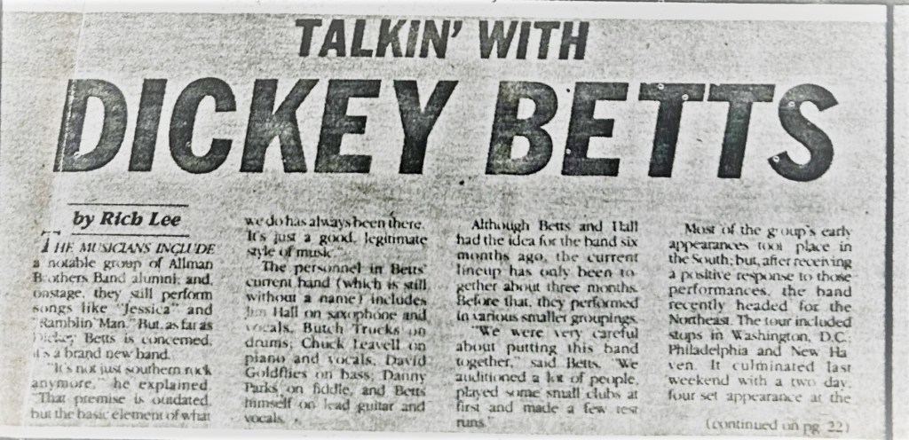 When I was covering rock’n’roll in the early 1980s, I scheduled a phone interview with Dickey Betts, but he never called.